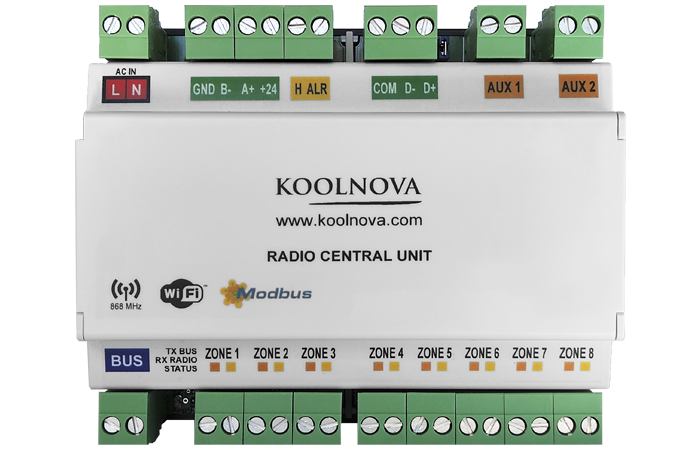 - une unité de contrôle novaplus radio, chargée de la gestion du système grâce à des passerelles filaires et infrarouges. Elle peut ainsi contrôler jusqu'à 4 unités, tout en agissant sur 8 zones de chauffage par l'air et 8 zones de chauffage par le sol. Par ailleurs, elle permet de programmer la gestion de l'efficience de la machine et elle peut contrôler simultanément la température de l'air et du plancher en mode automatique. L'horloge en temps réel permet de prévoir jusqu'à 32 programmes par semaine (avec un maximum de 4 programmes par zone). Aussi, c'est l'unité de contrôle qui contient le module wifi pouvant communiquer avec le cloud Koolnova.